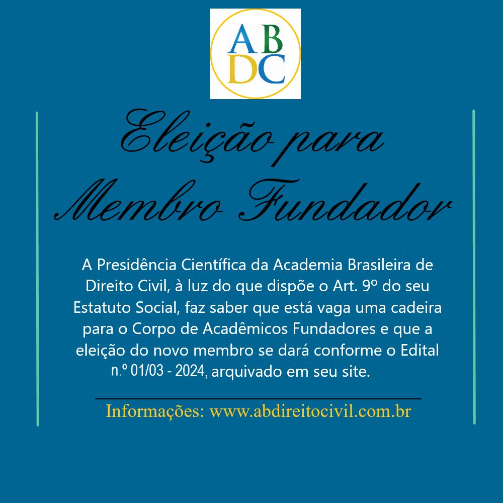A Presidência Científica da Academia Brasileira de Direito Civil, no uso das suas atribuições e à luz do que dispõe o Art. 09º do Estatuto Social, faz saber que está vaga uma cadeira do Corpo de Acadêmicos Fundadores da instituição e que a eleição do novo membro se dará conforme o regulamento contido no Edital nº 01/03 – 2024