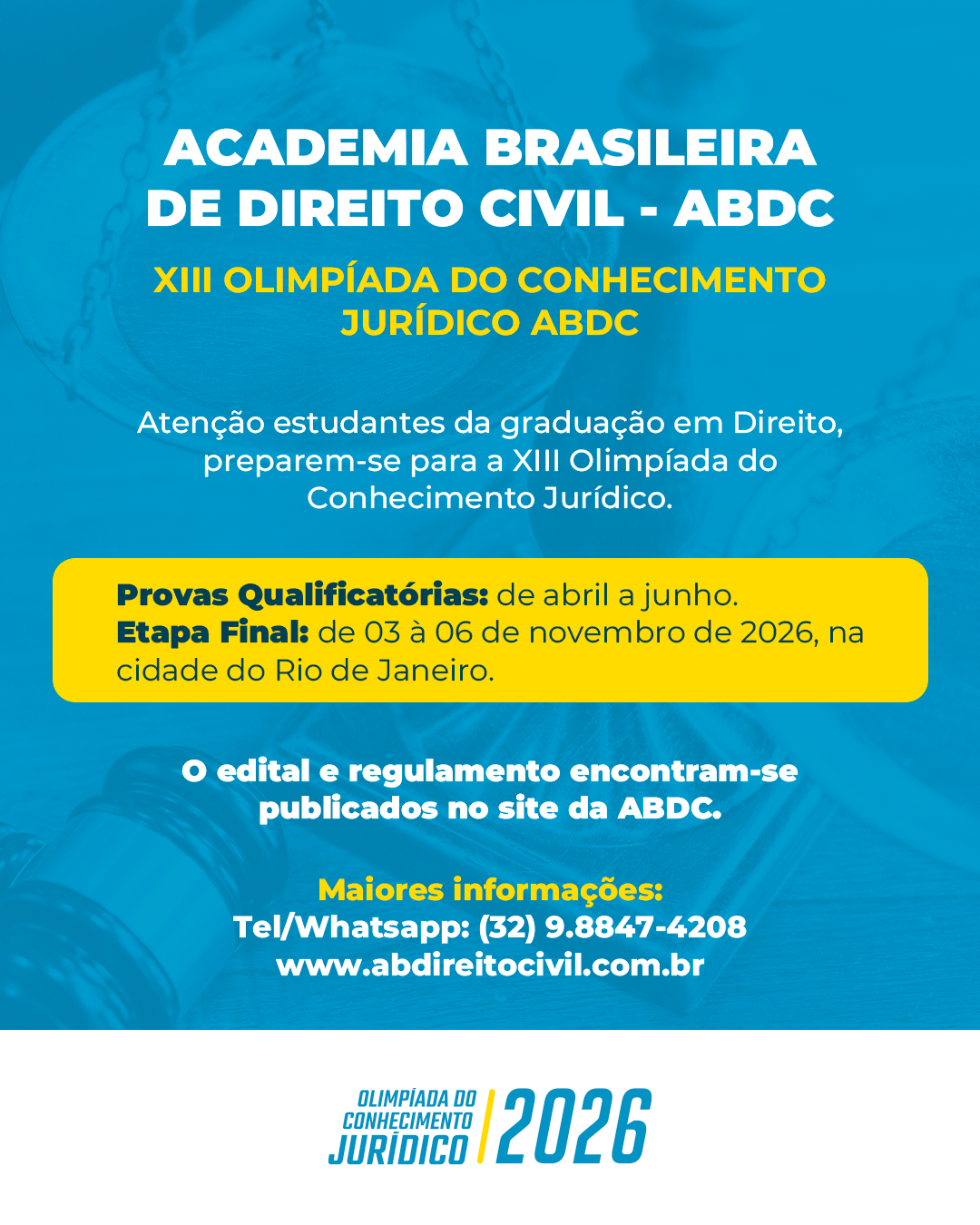 A Academia Brasileira de Direito Civil (ABDC), torna público que realizará a Olimpíada do Conhecimento Jurídico, mediante as disposições contidas no Edital e no Regulamento em anexo.