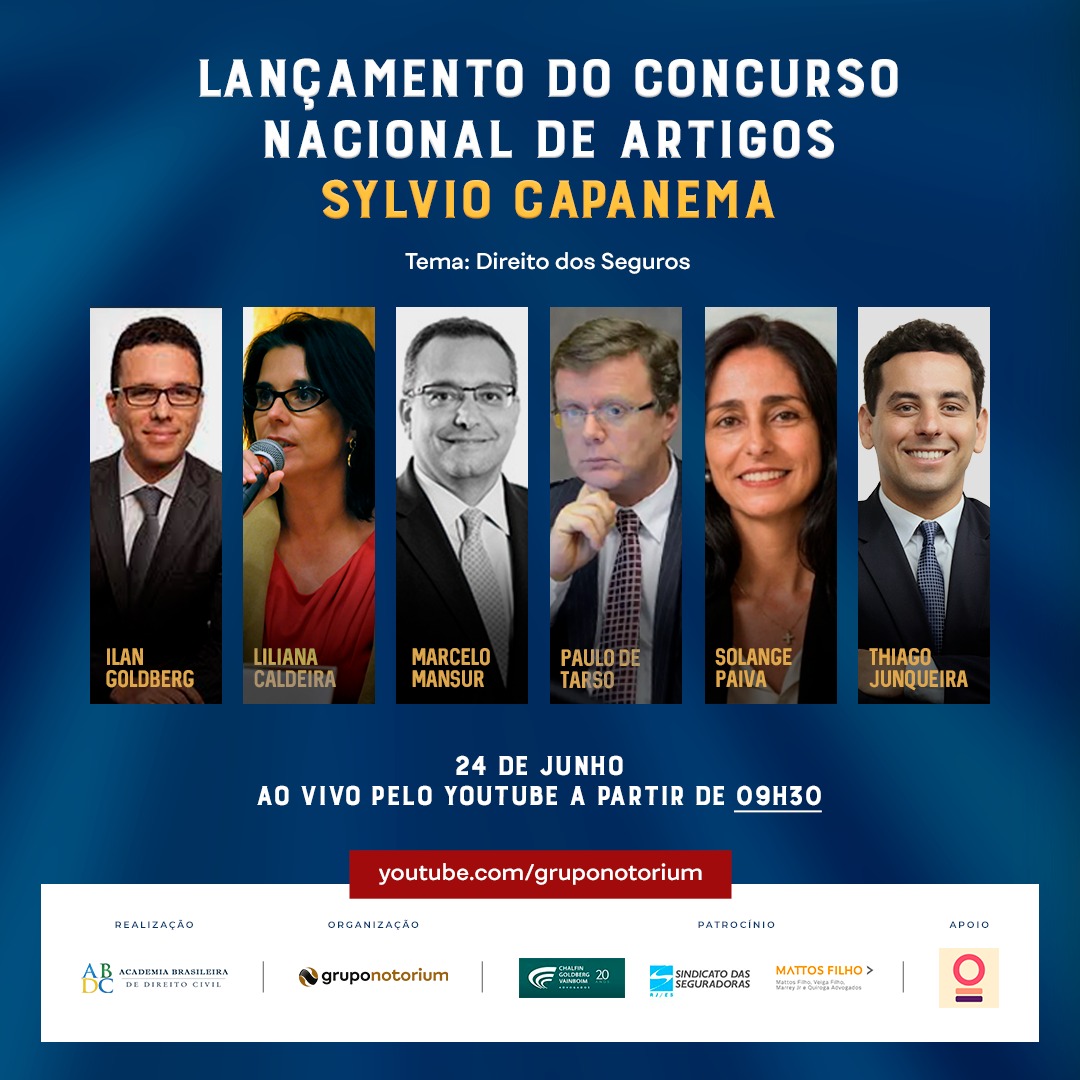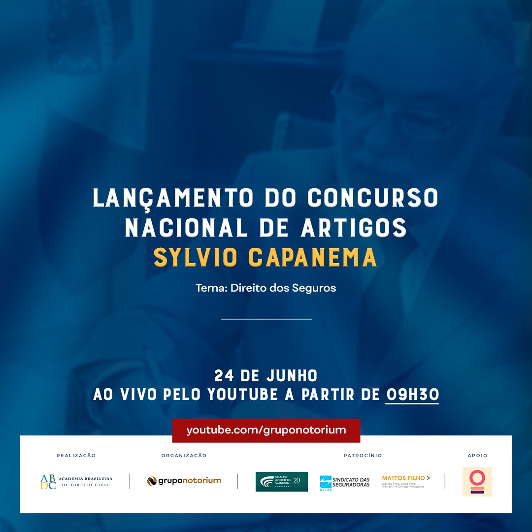 A Academia Brasileira de Direito Civil – ABDC, em parceria com o Grupo Notorium Eventos, torna público o lançamento do I Concurso Nacional de Artigos – Prêmio Sylvio Capanema, que será realizado no dia 24 de junho de 2021, às 09h30, com transmissão direita pelo canal do Youtube do Grupo Notorium Eventos.