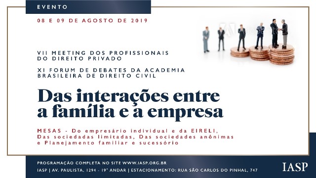 A Academia Brasileira de Direito Civil – ABDC, em parceria com o IASP – Instituto dos Advogados de São Paulo, realizará o VII Meeting dos Profissionais do Direito Privado – XI Fórum de debates da Academia Brasileira de Direito Civil, onde o tema será: “Das Interações entre a Família e a Empresa”. O evento será realizado nos dias 08 e 09 de Agosto, na sede do IASP, situada na Avenida Paulista, 1294 – 19º andar – Edifício Eluma.
